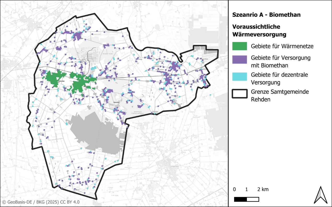 Einteilung der beplanten Teilgebiete der Samtgemeinde Rehden in voraussichtliche Wärmeversorgungsgebiete in Szenario A – Biomethan. Quelle: Eigene Darstellung