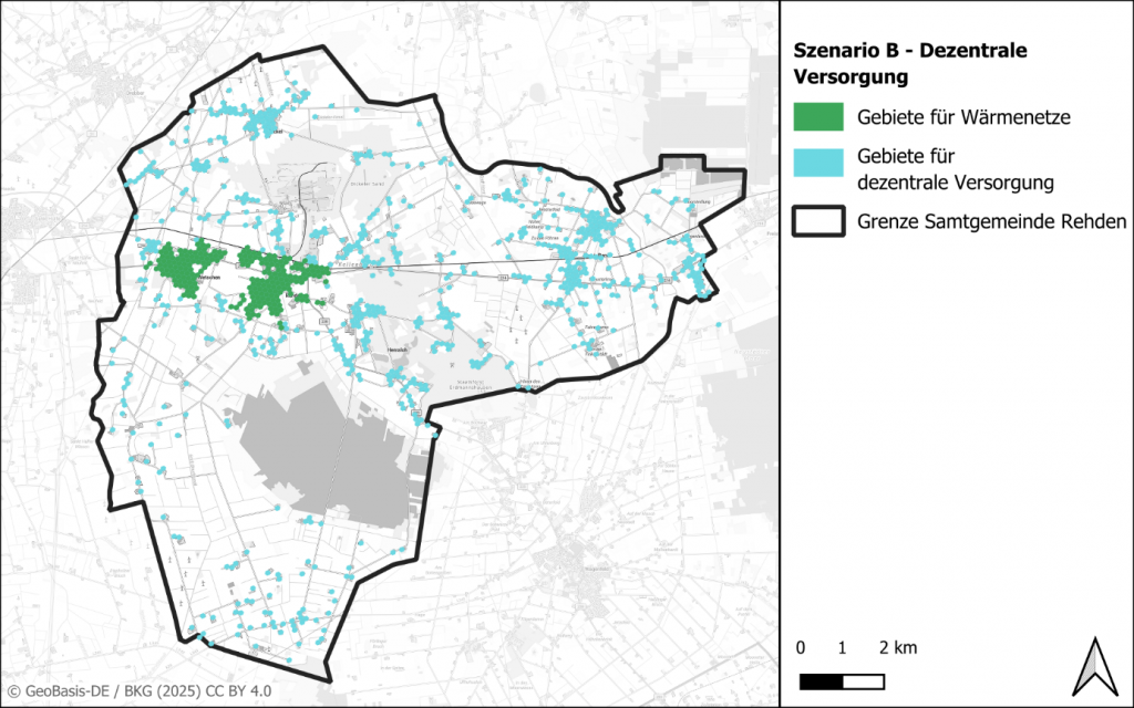 Einteilung der beplanten Teilgebiete der Samtgemeinde Rehden in voraussichtliche Wärme-versorgungsgebiete in Szenario B – Dezentrale Versorgung. Quelle: Eigene Darstellung