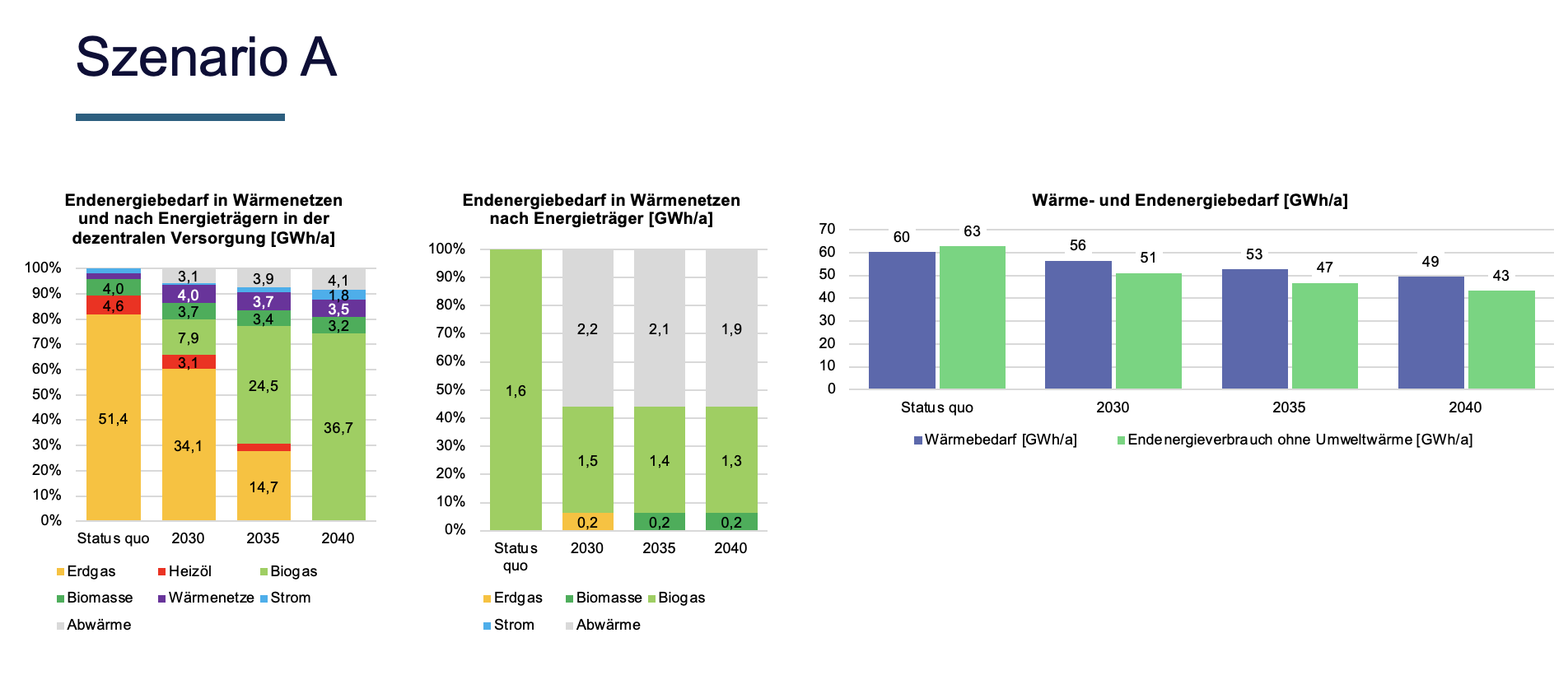 Im Szenario A – Biomethan wird das vorhandene Gasnetz mit lokal erzeugtem Biomethan weiter betrieben. Die Gebäude mit einem Anschluss an das Gasnetz können den Anschluss also weiterhin nutzen.