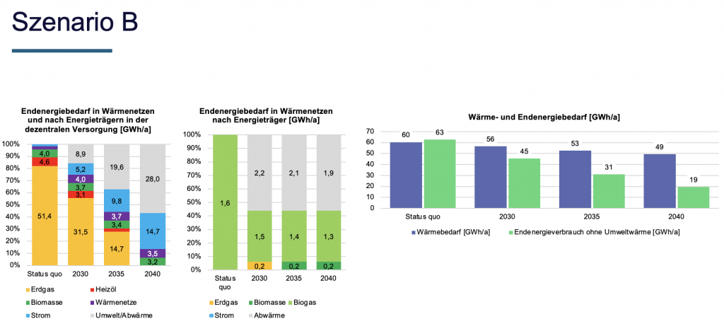 Im Szenario B – Dezentrale Versorgung werden die verbleibenden Gebäude dezentral versorgt, wobei Wärmepumpen den Hauptteil abdecken. Biomasseheizungen wie Pellet- oder Holzhackschnitzelheizungen werden in dem Rest der Gebäude eingesetzt.