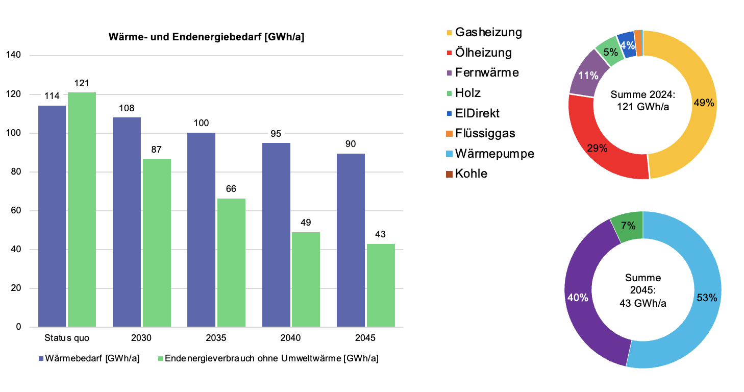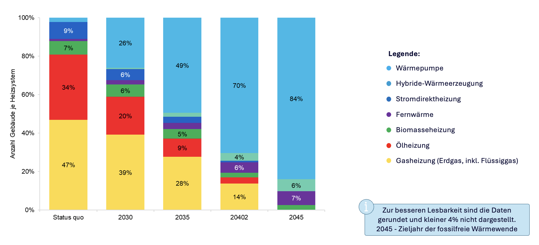 Im Zielszenario werden im Zieljahr 7 % der Gebäude über Fernwärme beheizt. Quelle: Eigene Darstellung