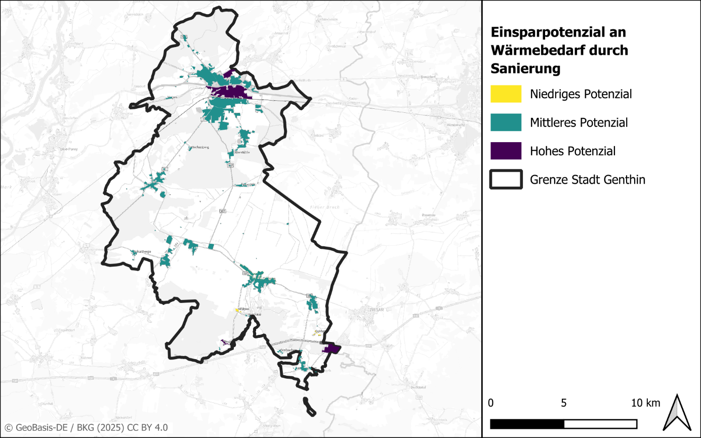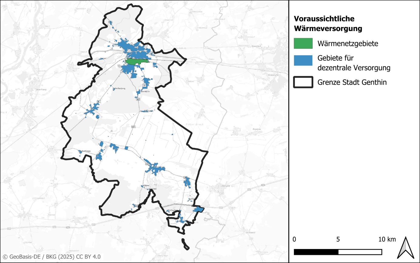 Für Genthin wurden die drei Teilgebiete Genthin Kern, Teilgebiet Genthin Bahnhof, Quartier Forststraße für eine wahrscheinliche zentrale Wärmeversorgung identifiziert. Alle Fokusgebiete weisen, zumindest in Teilen, eine hohe Wärmeliniendichte auf. Im Bereich der drei Fokusgebiete ist gemäß der Potenzialanalyse mit der industriellen Abwärme ein gut geeignetes Potenzial vorhanden. Die dezentrale Versorgung wird voraussichtlich über Umgebungsluft und nur zu einem kleinen Teil über Biomasseheizungen erfolgen.