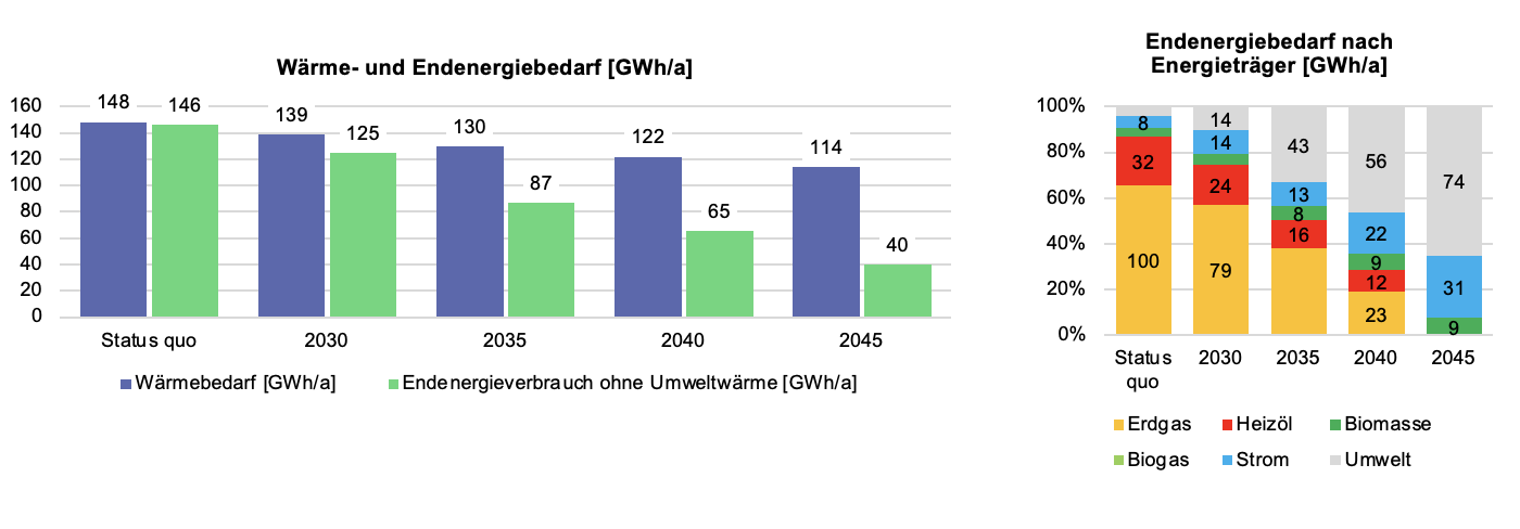 Jährlicher Wärmebedarf und Endenergieverbrauch der gesamten Wärmeversorgung in Gigawattstunden pro Jahr in den Stützjahren 2030, 2035 und 2040 sowie im Zieljahr 2045, differenziert nach Endenergiesektor und Energieträger. Quelle: Eigene Darstellung