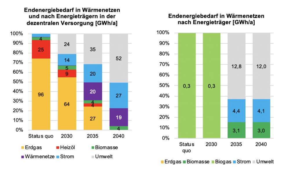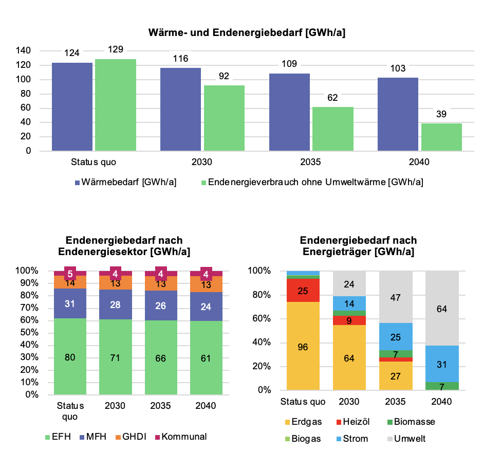 Jährlicher Wärmebedarf und Endenergieverbrauch der gesamten Wärmeversorgung in Gigawattstunden pro Jahr in den Stützjahren 2030 und 2035 und im Zieljahr 2040, differenziert nach Endenergiesektor und Energieträger. Quelle: Eigene Darstellung.