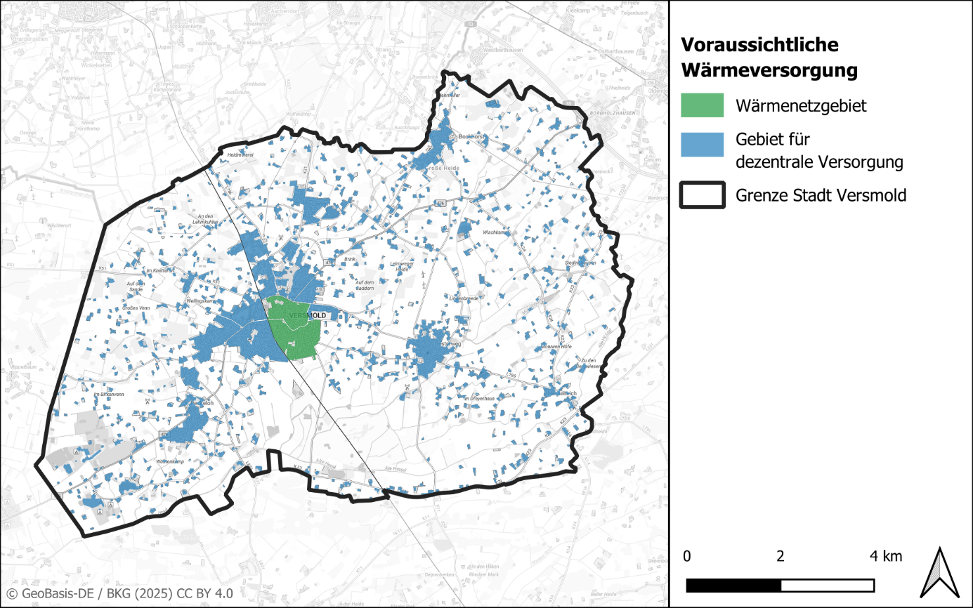 Einteilung der beplanten Teilgebiete der Stadt Versmold in voraussichtliche Wärmeversorgungsgebiete. Quelle: Eigene Darstellung