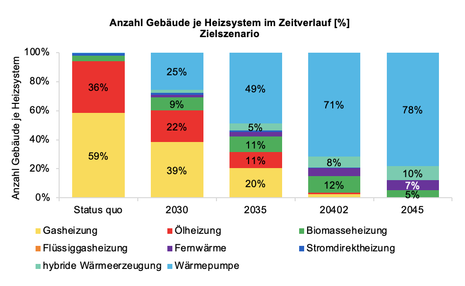 Anteil der Gebäude je Heizsystem in Prozent, Entwicklung Status quo bis 2045 im Szenario „Zielszenario“. Quelle: Eigene Darstellung