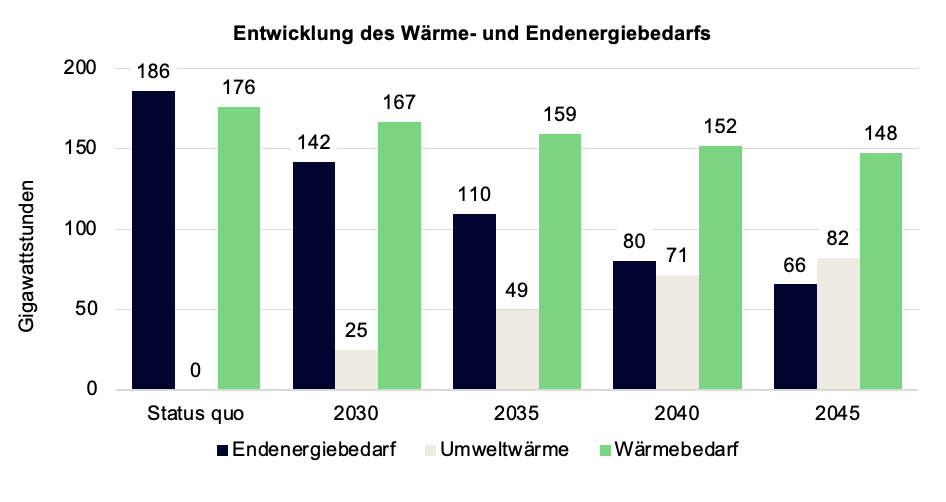 Entwicklung des jährlichen Wärme- und Endenergiebedarfs in Gigawattstunden im Zielszenario. Quelle: Eigene Darstellung